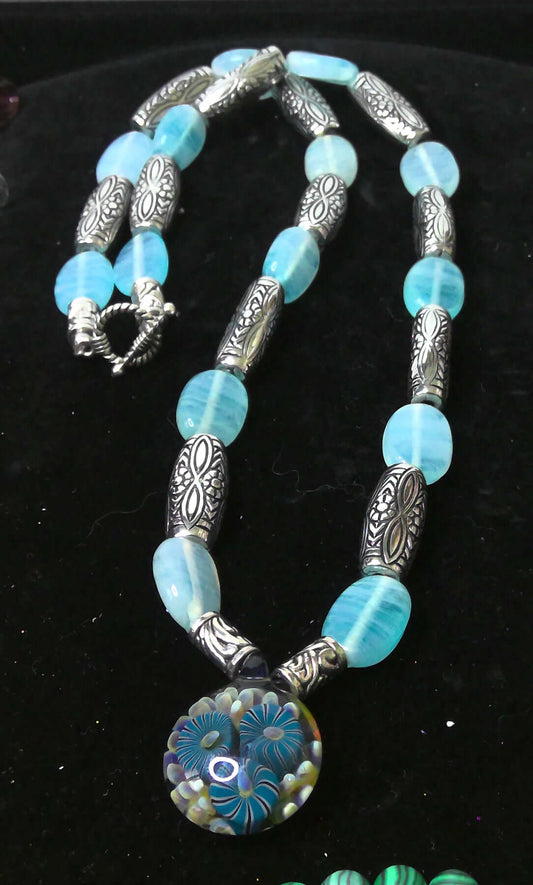 Blue Antique Beads and Flower Art Glass Pendant